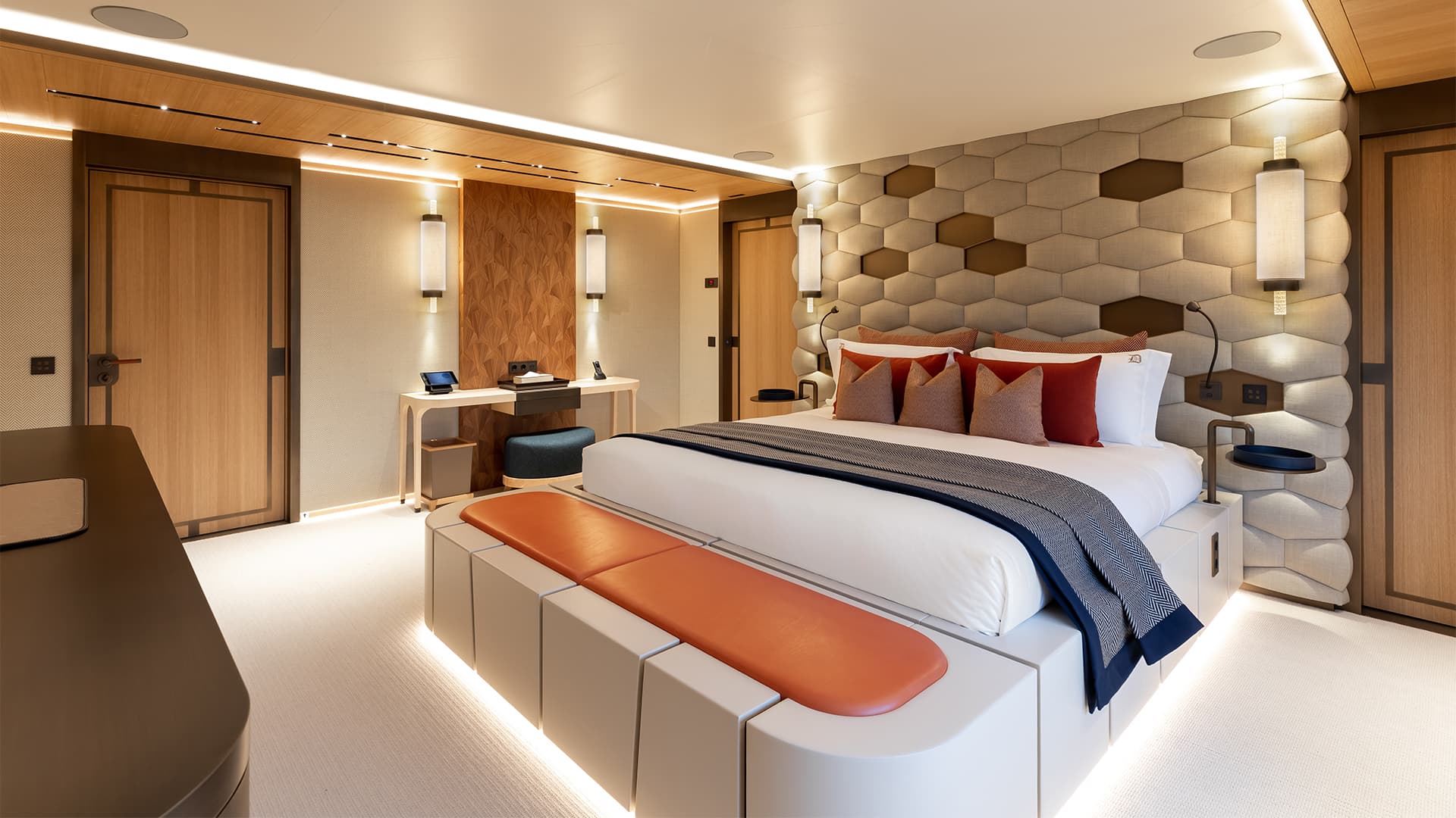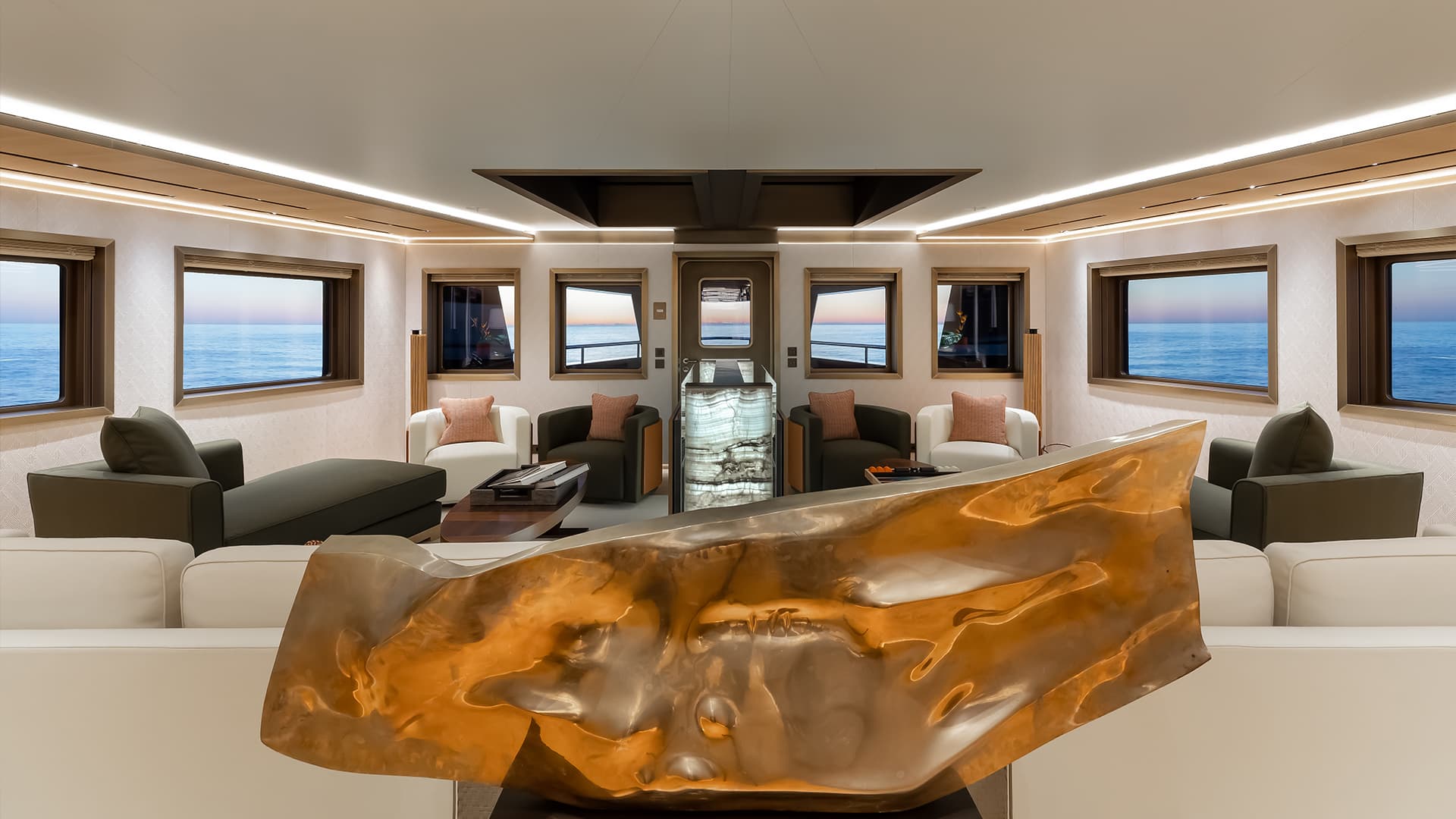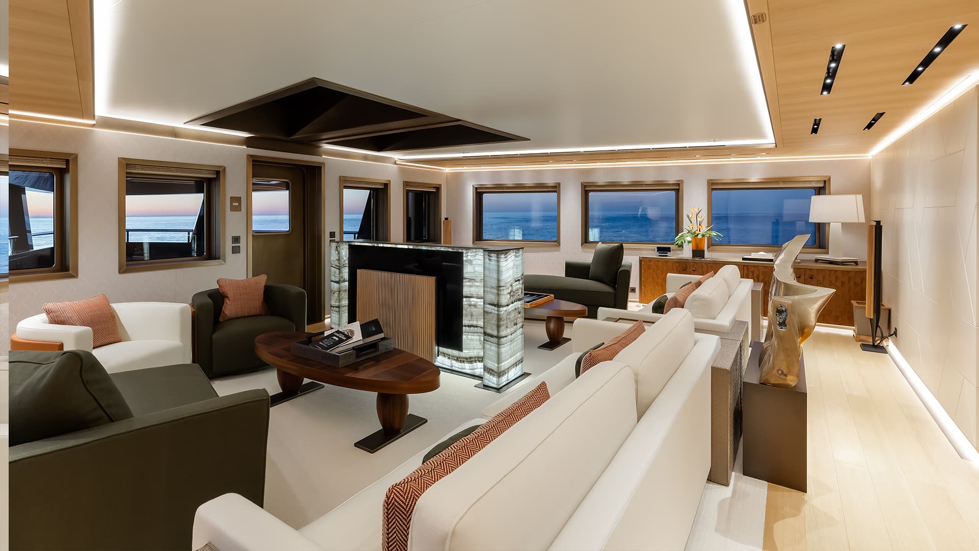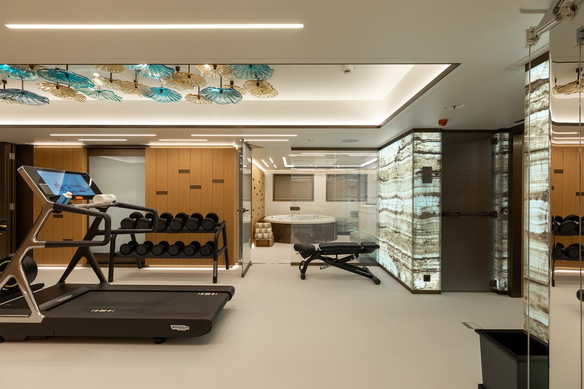 Six richly appointed staterooms- each including a walk-in dressing room and an en-suite bathroom- comfortably accommodate 12 guests. On the lower deck, there is a Turkish bath and sauna, massage studio, and a gym. On the yacht’s upper decks, there are a variety of locations from which to take in the sweeping landscape views, whether from a railing or Jacuzzi.