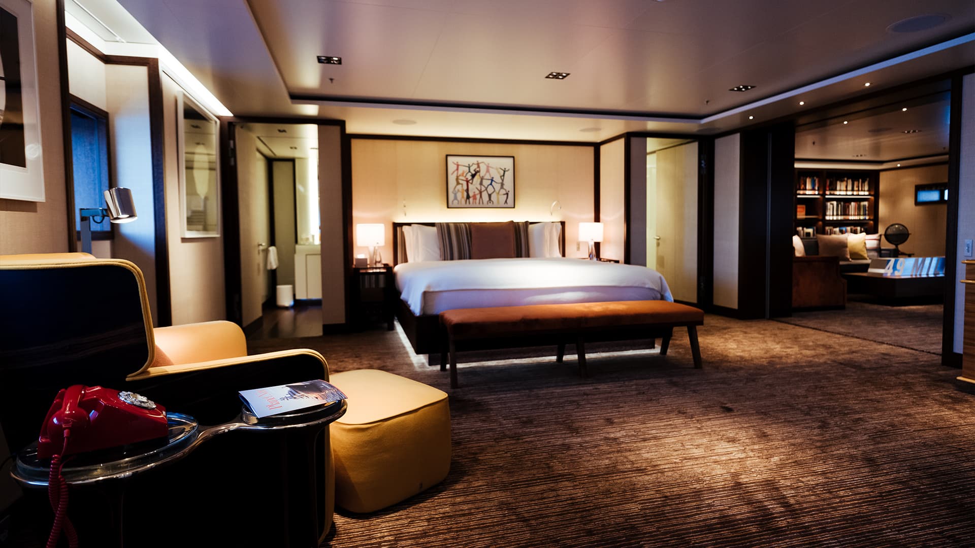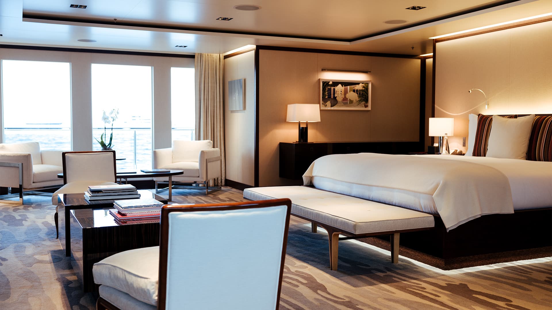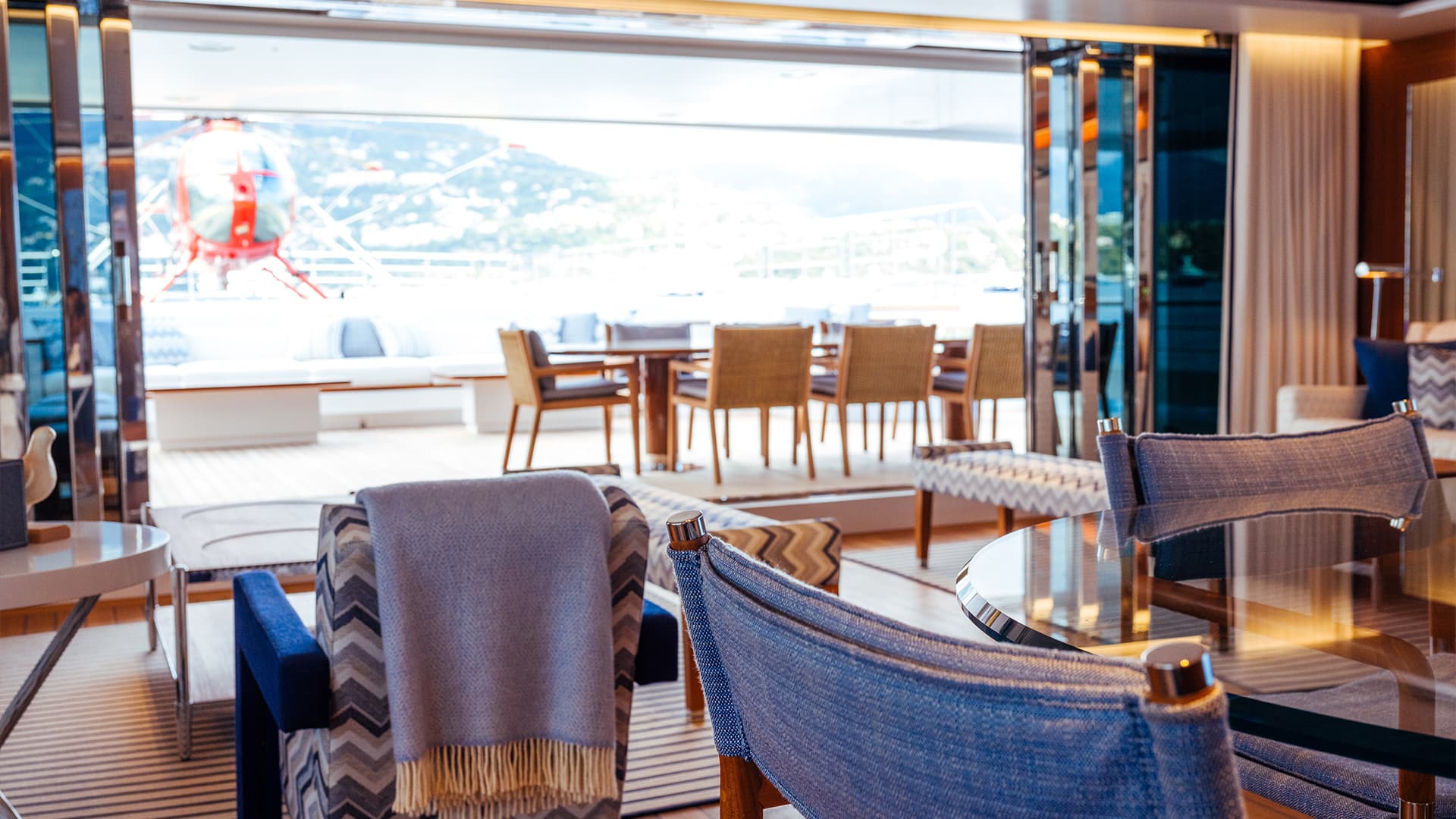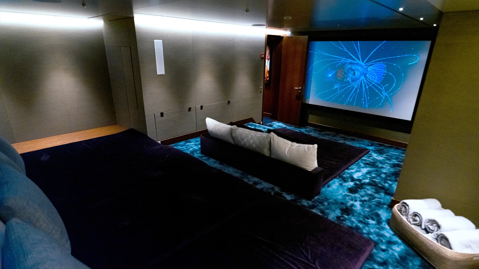 Planet Nine’s interiors are comfortable, inviting and modern. Retractible glass panels and large windows throughout merge the outdoors and interior, bringing guests closer to the surrounding landscapes. All the way forward, a large observation lounge wraps around the yacht just underneath the bridge, providing stunning views for scenic cruising. A second VIP stateroom opens onto a private, aft facing terrace.