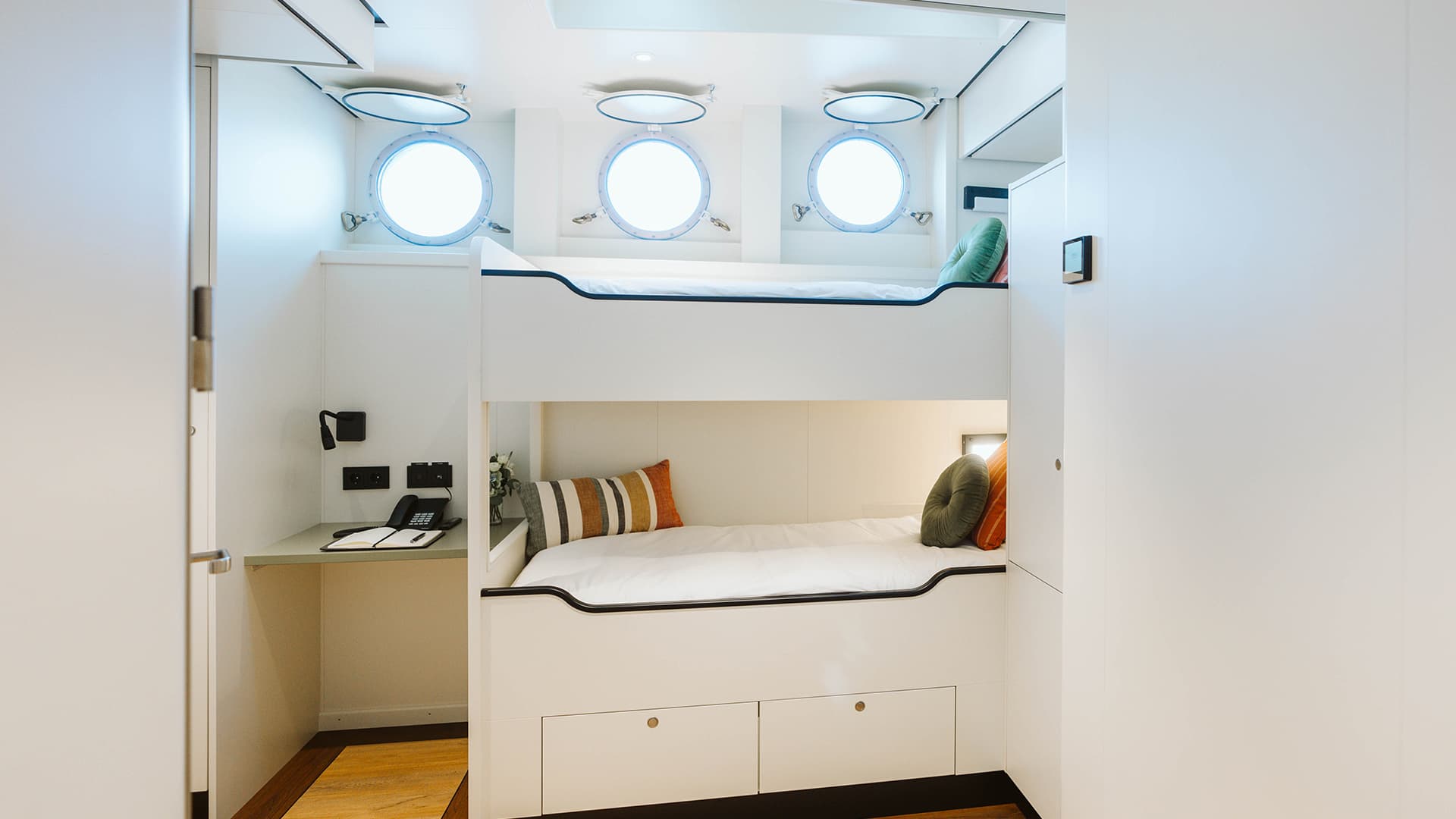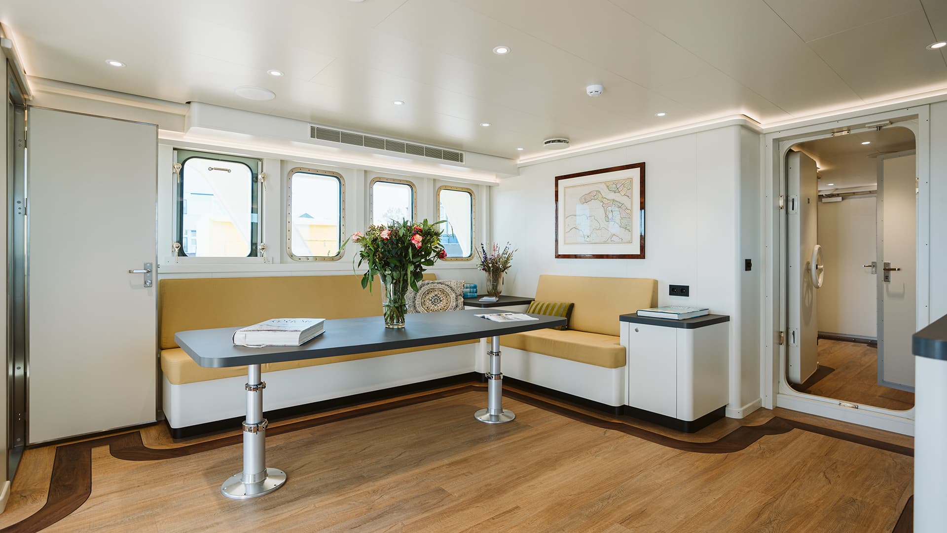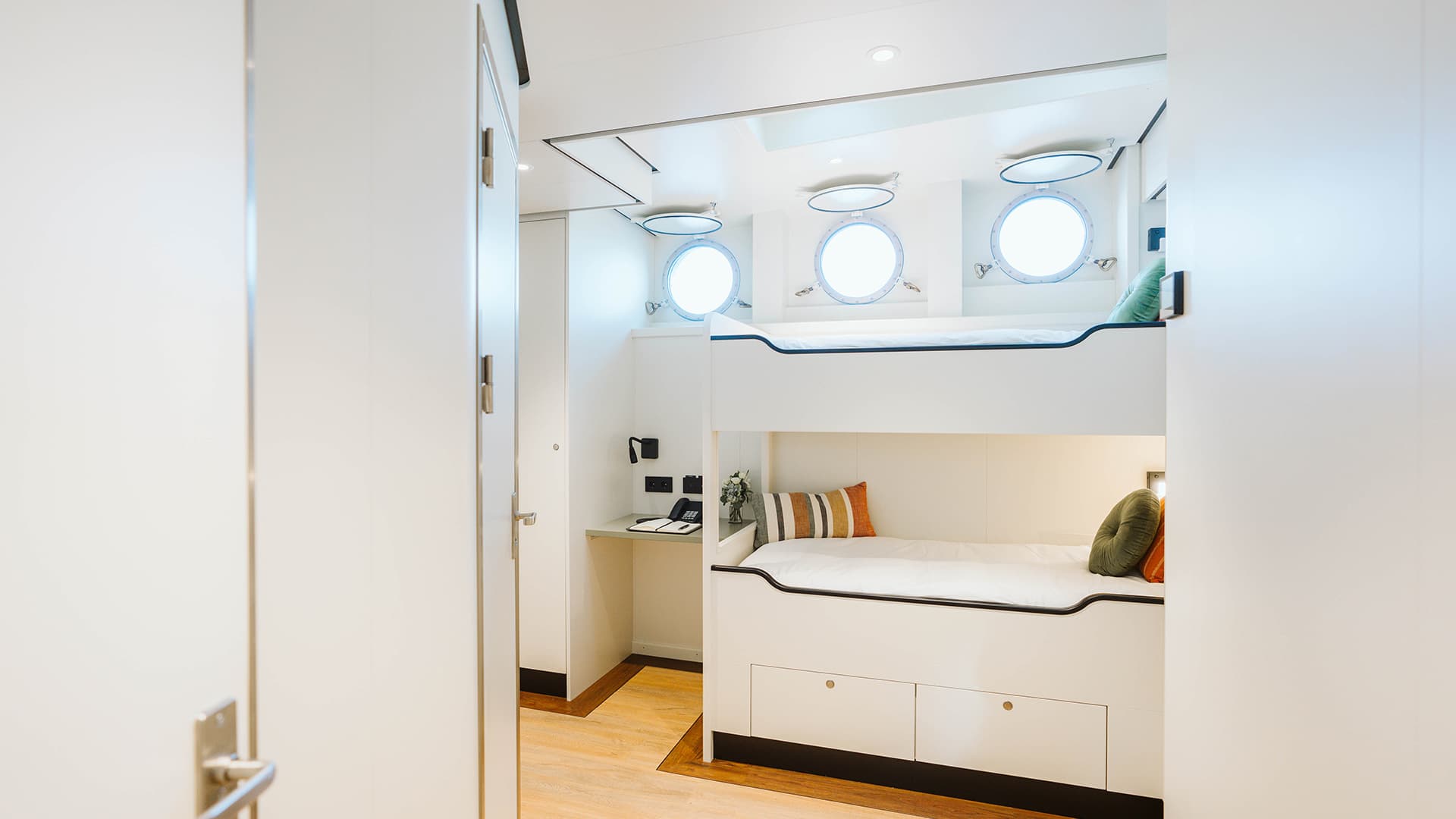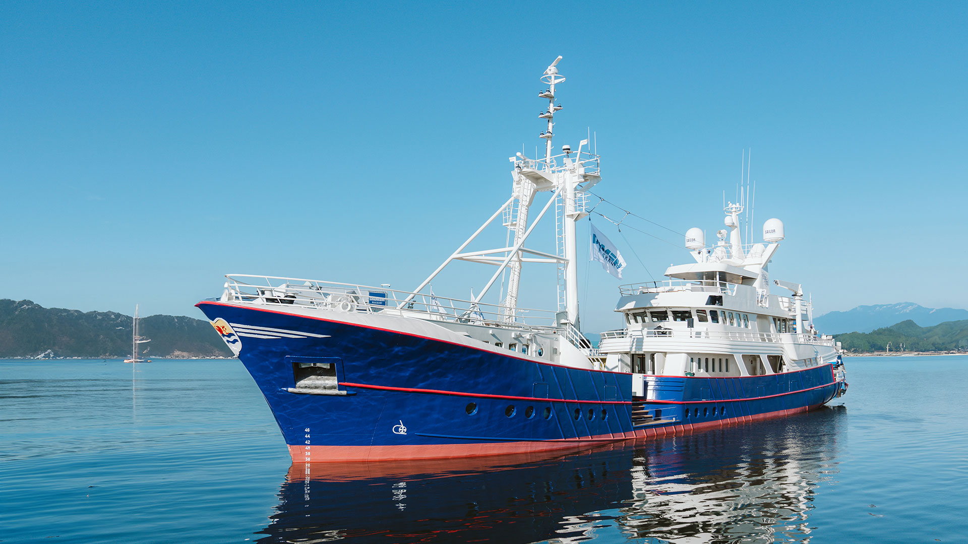 46m Scintilla Maris is a brand new expedition yacht built on the recycled hull of a classic DAMEN trawler design. With new hybrid engines offering four sailing modes, she is extremely efficient and nearly vibration-free— a nimble vessel ideal for exploration. Her flexible cabin configuration and crew/guest ratio means the yacht and crew can adapt their level of service to perfectly match guests’ requirements.